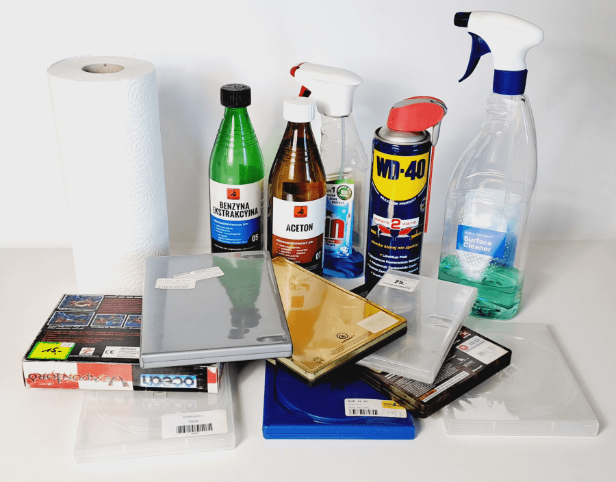 W pierwszej kolejności zawsze warto wyjąć wszystkie okładki, manuale i nośniki. Nie chcemy ich zniszczyć przy okazji czyszczenia samego pudełka. W znacznej większości przykładowych sposobów czyszczenie zajmie do kilku minut, wiec można spokojnie odłożyć zawartość pudełek na bok i po chwili wszystko będzie mogło wrócić na swoje miejsce.
